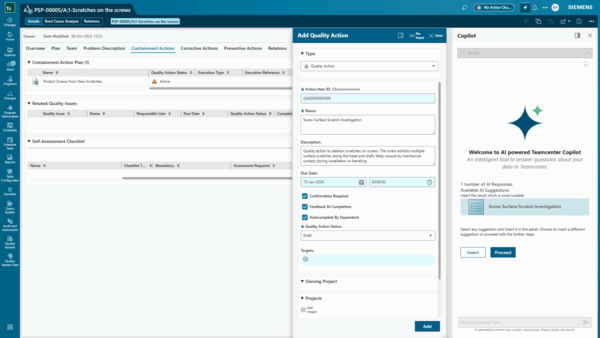 Ví dụ về cách Teamcenter Copilot Quality hỗ trợ việc tạo đề xuất cho các đơn vị đánh giá chất lượng.