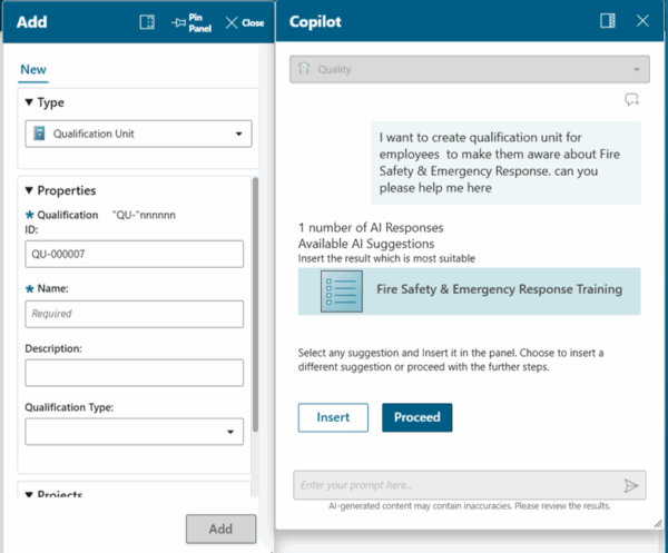 Copilot Quality đề xuất đơn vị, hồ sơ và nhóm chứng nhận.