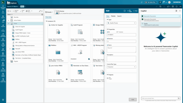 Phiên bản Teamcenter Quality 2512 mang đến nhiều cải tiến về tính năng và khả năng sử dụng, nổi bật với Teamcenter Copilot Quality – bộ công cụ AI giúp nâng cao hiệu quả quản lý chất lượng và tuân thủ.