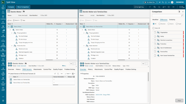 So sánh nâng cao giữa bản gốc và bản biến thể trong Teamcenter Quality FMEA
